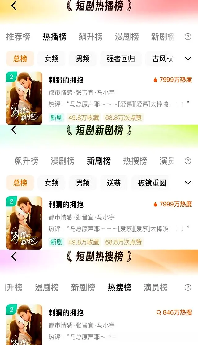 这么火爆的成绩背后,怎么看都有点“反常”。毕竟,短剧市场的天花板似乎一直停留在某个水平线,但《刺猬的拥抱》打破了这个界限,成为2024年第一季度的“黑马”。从开播当天的7999万热度,到次日轻松破8500万,甚至一度登顶热播榜TOP1,难道真的是“审美升级”或者“内容精品”的结果?还是说,市场早就需要这股新鲜血液?当然,不能忽视的是,演员的表现尤为关键。马小宇突破了自己以往的霸总角色,变得更有层次和魅力,而张晋宜也用干练的职场造型和细腻的演技赢得了掌声。